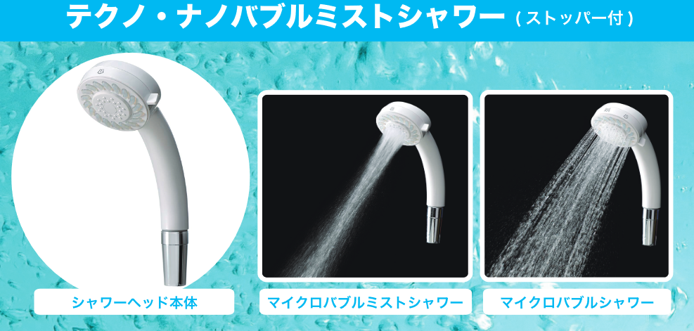 多機能付マイクロ・ナノバブシャワー(キャビテーション方式、特許取得済み) 通常シャワー+ミストシャワー+ミスト&通常シャワー+ストップの4段切替機能付 ナノバブル発生量=1億5千万個/1cc (業界No1) 詳細はこちら (PDFファイル) |