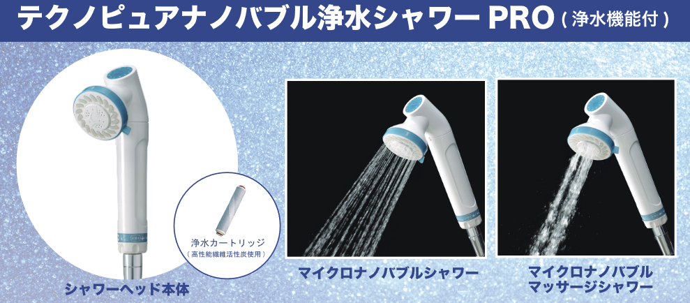 業界唯一の本格浄水機能+正統派キャビテーション方式(特許取得済み)によるマイ クロ・ナノバブル発生シャワー。 浄水機能は除塩素能力初期数値100%に加え、サビや微細な汚れも除去可能 浄水と原水の切替、マッサージシャワーと通常シャワー、ストップの5段階切替。 ナノバブル発生量=1億5千万個/1cc (業界No1) 詳細はこちら (PDFファイル) |